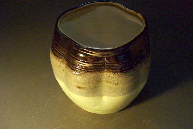 A touch of color and detail...Raspberry glaze on the lip, then a snowflake crystal glaze dipped up almost to the top...makes an interesting mix doesn't it?