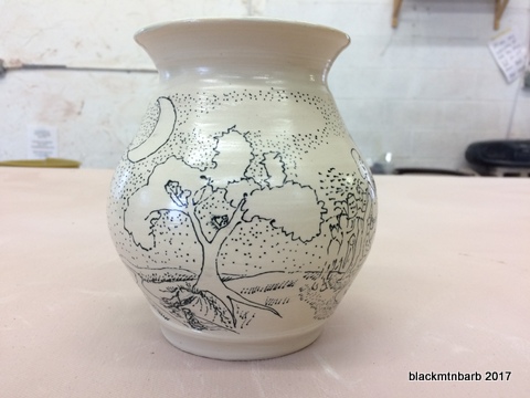 The curve of the pot isn't as bad as those little finger grooves which inevitably happen on hand thrown pots. They catch the point of my "designer liner" and give either a wobbly line, or a skipped line. And with my eyesight, I never know they are there until a line has a blip in it. Good thing there is a quick correction method. A sharp blade, or even a pin, can scrape the glaze off almost completely. Of course it does leave a change in texture of the surface, but compared to the other ones that are already there, it's not noticeable...especially since a coat of clear matt glaze will be painted over the whole thing. And sometimes I don't correct my wobbly lines, cause I want folks to know I'm not a machine and I'm very imperfect.