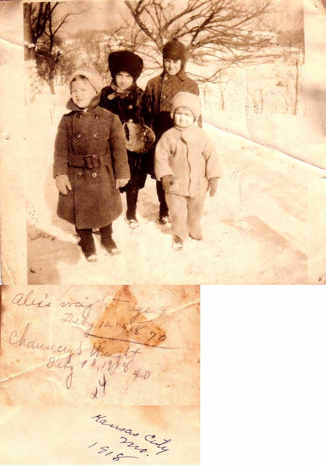 | Chauncey, Zulie, Alex, and George, Kansas City, Mo 1918 George was 4 as they visited their mother's sister's family. Zulie was a cousin while Chauncey and Alex were his older brothers. |