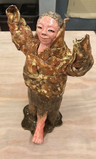 There's a new tree goddess in the studio. She's top shelf. Has lots of glazes on her...chocolate brown, black oxide to show the cracks, palest pinks and whites on "human" parts (face and feet)...nutmeg and eggshell too. What will she look like when finished in the kiln?